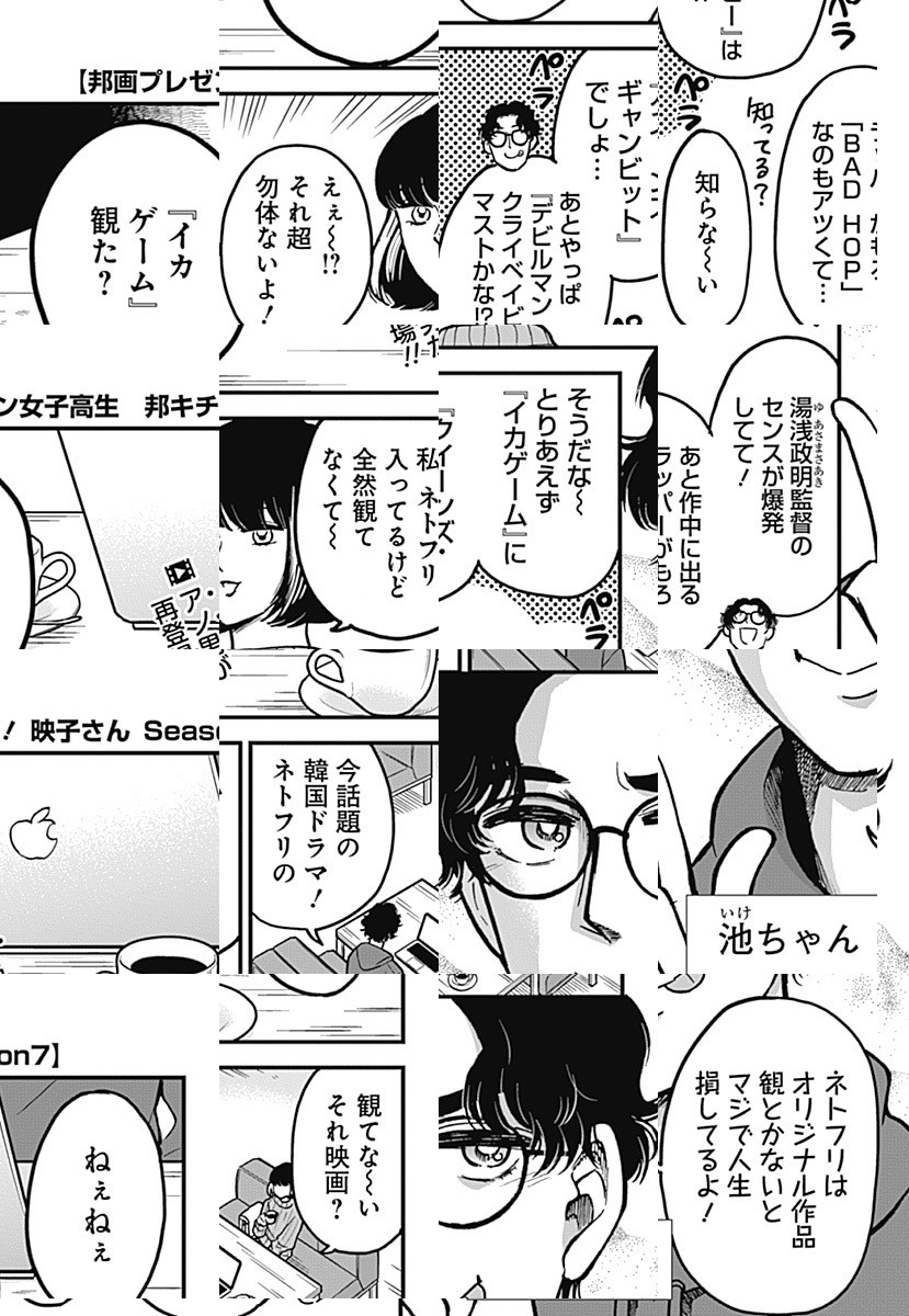 邦画プレゼン界の大立者! 『邦キチ』が孤高のシーズン15で華麗に舞う!! 今回も「映画について語る若人の部」を舞台に、国宝級の邦画中毒女子高生・邦キチが、まずまずの洋画好きな部長・洋一を相手に絶妙なチョイスの邦画(一部例外アリ)を愚直にプレゼン!プレゼン!!プレゼン!!! その視点、その愛情、その圧力ーー。全てにおいてシーズン14を凌駕ッ!! 銀河系初の邦画プレゼン漫画、すでに伝統芸能の域です…!! 【※映画について語る若人の部への映画相談も、「ファンレターを送る」からご応募ください。質問の冒頭に【映画相談】とタイトルを付けて、ペンネームも忘れずにご記入ください。(例:【映画相談】 P.N. ホウキチ)※質問を漫画で紹介する際は、質問内容を一部変更させていただく場合がございます。】