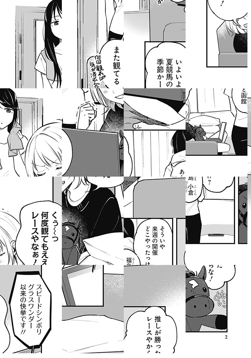 「八万円の家賃を折半すれば……月々4万円勝ちから競馬ができる!」 とルームシェアすることになった競馬好き女子大生の愛と恵那。 いつものようにダラダラと競馬中継を観つつネット投票で馬券を買い、ディープな競馬話に花を咲かせるも、お互いに自分といて楽しいのだろうかと疑問に思い…!? 正反対の二人が織りなす競馬×同棲ストーリー!